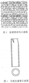 汽室。(2)全部給水(含各種補(bǔ)給水)經(jīng)水入口混管混合后送入水室,供除氧用;旃艿奶攸c(diǎn)是利用噴射器的原理混合不同壓力的水。(3)旋膜管用無縫鋼管,并上、下鉆有射流孔、泡沸孔制成。旋膜管排列示意如圖3。旋膜管為傳熱傳質(zhì)主要部件,依其功能分為3種,即主件管、排水管和排汽管,按設(shè)計(jì)要求選擇旋膜管的數(shù)量和進(jìn)行工藝布置。排水旋膜管具有射流、旋膜和泡沸功能,當(dāng)停用時(shí)可排出水汽室內(nèi)的積水。排汽旋膜管除具有傳熱傳質(zhì)功能外,還可排除1級(jí)除氧組件下隔板上部的氣(汽)體。(4)雙流連通管由無縫鋼管制成,示意如圖4,它的主要作用是導(dǎo)回汽水分離室內(nèi)分離下來的積水和旋膜管帶出的積水,排出除氧塔自由空間上部的氣(汽)體,并在管內(nèi)使兩種介質(zhì)進(jìn)行換熱。(5)自由空間亦稱水膜裙室,相當(dāng)于除氧器的霧化區(qū),它是旋轉(zhuǎn)膜作用的終程。每個(gè)旋膜器的水裙最大可用面積由試驗(yàn)確定。由于除氧水溫在自由空間內(nèi)已近于飽和溫度,水中氧的解析也應(yīng)該全部或接近于全部完成。實(shí)測(cè)結(jié)果說明,水膜裙形態(tài)及自由空間的容積對(duì)除氧效果有直接影響!