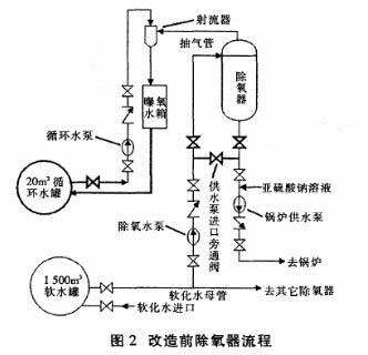 其工藝為:待除氧軟化水進(jìn)入高水位真空除氧器,經(jīng)過(guò)進(jìn)水分配器噴嘴呈霧狀均勻落下,經(jīng)過(guò)塑料多面球填料層,水中逸出的溶解氧被抽真空裝置不間斷抽走,除氧水由供水泵送到鍋爐使用,由于真空除氧器的除氧深度設(shè)計(jì)為500μg/L,需要加入亞硫酸鈉作化學(xué)輔助除氧。真空除氧器的除氧指標(biāo)為低于500μg/L,加入亞硫酸鈉除氧后為10μg/L以下。 2真空除氧器存在的問(wèn)題 該站給水除氧系統(tǒng)運(yùn)行10多年,工藝、設(shè)備等方面一直存在缺陷,一是造成溶解氧超標(biāo),最高達(dá)1000μg/L,二是在不使用真空除氧器時(shí),除氧泵與供水泵直接串聯(lián)運(yùn)行,導(dǎo)致鍋爐進(jìn)口水壓低、水流量低故障停爐,切換真空除氧器時(shí)流程復(fù)雜。除氧系統(tǒng)如圖2所示,通過(guò)分析,發(fā)現(xiàn)系統(tǒng)存在問(wèn)題主要有以下幾點(diǎn)。