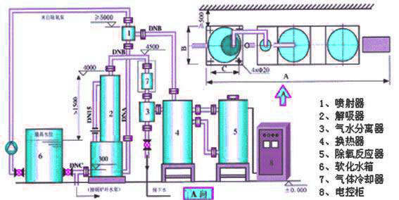 一、解析除氧器概述: CJY系列第四代新型解析除氧器裝置,用于脫除鍋爐給水或熱網(wǎng)補(bǔ)給水以及各種工業(yè)過(guò)程用水中的溶解氧。處理標(biāo)準(zhǔn)達(dá)到GB1576-96《低壓鍋爐水質(zhì)標(biāo)準(zhǔn)》要求的2T/h以上的蒸氣鍋爐及水溫95℃以上的熱水鍋爐的水質(zhì)除氧標(biāo)準(zhǔn)。解析除氧器裝置克服了熱力除氧、真空除氧、氧化還原樹脂除氧、亞硫酸鈉加藥除氧等方中除氧方法存在的不足,在第三代解析除氧的基礎(chǔ)上加以改進(jìn)和發(fā)展。經(jīng)廣大用戶使用,具有占在面積小、操作簡(jiǎn)單、設(shè)備儀表控制一體化、一次性投資少、設(shè)計(jì)、安裝、運(yùn)行管理方便、運(yùn)行費(fèi)用低、不受熱負(fù)荷變動(dòng)影響、連續(xù)、間斷運(yùn)行均能達(dá)標(biāo),是工業(yè)鍋爐與熱水鍋爐的除氧方式。二、解析除氧器工作原理: 根據(jù)《享利定律》,氣體在液體中的溶解度和該氣體在水氣分界面上的平衡分壓力[P]成正比即:C=KP 氣體中氧的分壓力又與氣體中氧的含量成正比,因此將含氧水與脫氧的高純惰性氣體強(qiáng)烈混合,使溶解于水中的氧氣大量擴(kuò)散到氣體中,從而使鍋爐給水達(dá)到水質(zhì)標(biāo)準(zhǔn)的要求;含氧氣體通過(guò)系統(tǒng)循環(huán)回到除氧反應(yīng)器,重新反應(yīng)生成無(wú)氧氣體后循環(huán)作用。該解析除氧器裝置使用研制的新型催化反應(yīng)劑,具有強(qiáng)度高、反應(yīng)快、反應(yīng)溫度低、處理水量大、除氧效率高等特點(diǎn)。 三、解析除氧器特點(diǎn): 1.節(jié)約能源。待除氧水不需加熱予處理,即水溫在常溫時(shí)就可進(jìn)行解析除氧,不存在因自耗熱能而增加鍋爐容量的問(wèn)題,節(jié)電節(jié)能。 2.投資少。解析除氧器經(jīng)組合裝配后,高位低位布置均可,占地面積少節(jié)省空間,管路系統(tǒng)簡(jiǎn)單,設(shè)計(jì)安裝方便,整個(gè)系統(tǒng)不但節(jié)省了設(shè)備和廠房的投資,還克服了水箱密封的難題。 3.效果明顯。解析除氧器出水量大,氣密性高,熱負(fù)荷適應(yīng)性強(qiáng),可使常溫水除氧,出水殘余溶解氧濃度低至0.03~0.1mg/l,除氧效率達(dá)到98~99%。 4.操作簡(jiǎn)單。解析除氧器自動(dòng)控制,一按電鈕即可運(yùn)行,電熱元件可根據(jù)負(fù)荷情況自動(dòng)切換,節(jié)約能耗。除氧反應(yīng)劑反應(yīng)后不留殘?jiān)瑹o(wú)需人工排渣。 5.自動(dòng)檢測(cè)?刂撇糠衷O(shè)有控制器和溶解氧分析儀,直接監(jiān)測(cè)出水含氧量,無(wú)需化驗(yàn)取樣測(cè)定,可從表中直讀出水中的溶解氧含量。 6.適用廣泛。可廣泛用于工作壓力≤1.6MPa的蒸汽鍋爐和熱水鍋爐除氧,對(duì)鍋爐負(fù)荷經(jīng)常波動(dòng)的情況下,采用解析除氧方式是經(jīng)濟(jì)合理的。對(duì)單層布置的快裝、組裝鍋爐房及已運(yùn)行的鍋爐需加裝除氧器的尤為適用。四、解析除氧器性能規(guī)格:五、解析除氧器工作原理系統(tǒng)圖: 1、噴射器 2、解吸器 3、氣水分離器 4、換熱器 5、除氧反應(yīng)器 6、軟化水箱 7、氣體冷卻器 8、電控柜
